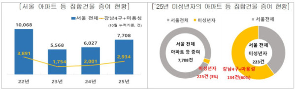 자료에 따르면 올해 1~10월 서울의 집합건물 증여는 7708건으로, 2022년 10월 기록 이후 3년 만의 최대치다. 특히 미성년자 증여는 223건으로 역시 3년 만에 가장 많았다. 국세청 분석에 따르면 이들 미성년자 증여의 절반 이상이 강남4구·마용성 등 가격 상승 선도 지역에 집중돼 부모 세대의 자산 축적이 자녀 세대로 고스란히 이전되는 양극화 우려도 제기된다.