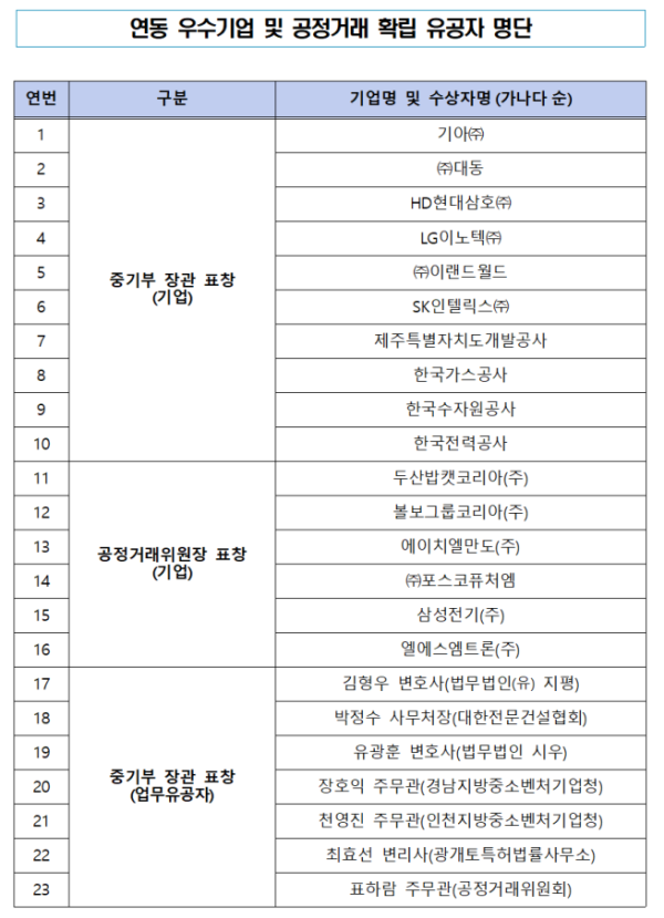 연동 우수기업은 총 16개사로 기아, 대동 등 10개사가 중기부 장관 표창을 수상하고 두산밥캣코리아, 볼보그룹코리아 등 6개사가 공정위원장 표창을 수상했다. 공정거래 확립 유공자 총 7명은 중기부 장관 표창을 수상했다.