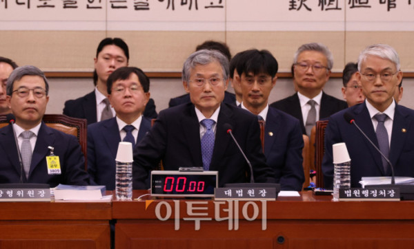 ▲조희대 대법원장이 13일 서울 여의도 국회에서 열린 법제사법위원회 국정감사에 참석하고 있다. 추미애 법사위원장은 조 대법원장을 관례대로 인사말 후 이석시키지 않고 참고인 신분으로 질의응답을 진행했다. 고이란 기자 photoeran@