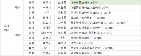이날부터 10일까지는 경기 광명시 '힐스테이트광명11', 양평군 '효성해링턴플레이스양평', 경남 김해시 '김해안동에피트', 경북 울진군 '마린시티', 울산 남구 '문수로코아루에듀스카이', 전북 순창군 '대상웰라움순창' 등 단지에서 정당계약을 실시한다. 또 이날부터 12일까지는 경기 김포시 '풍무역세권수자인그라센트1차(B2)'와 의정부시 '의정부우정A1(공공분양)' 등 단지가 계약을 진행한다.