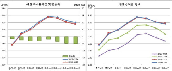 5일 채권시장과 금융투자협회에 따르면 통안2년물은 2.3bp 하락한 2.878%를 기록했다. 국고3년물은 3.1bp 내린 2.994%를 보였다. 이는 지난달 28일(2.991%) 이후 처음으로 3%를 밑돈 것이다. 국고10년물은 1.8bp 떨어진 3.358%를, 국고30년물은 4.7bp 하락한 3.211%를 나타냈다.