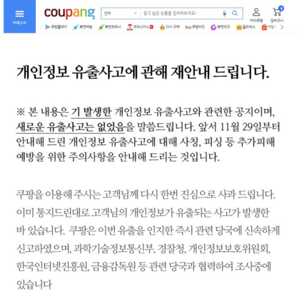 쿠팡은 이날 공지문에서 "고객님의 개인정보가 유출되는 사고가 발생한 바 있다"며 "새로운 유출 사고는 없었으며, 앞서 11월 29일부터 안내해 드린 개인정보 유출 사고에 대해 사칭, 피싱 등 추가피해 예방을 위한 주의사항을 안내해 드리는 것"이라고 밝혔다.