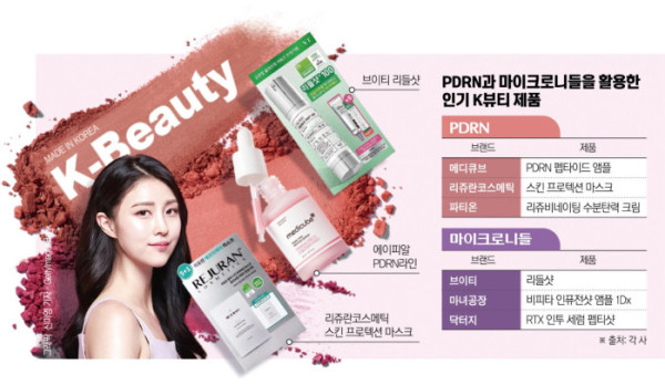 PDRN 인기에 트렌디한 브랜드부터 약국 화장품 브랜드, 뷰티 대기업까지 관련 화장품 개발에 뛰어들고 있다. 파마리서치의 화장품 브랜드 ‘리쥬란코스메틱’의 마스크팩은 특허기술 c-PDRN을 함유한 제품으로, 올해 올리브영 어워즈 ‘슬로우에이징’ 부문에서 수상하는 등 글로벌 인기를 끌었다. K뷰티 대표주자 에이피알의 브랜드 메디큐브는 PDRN 라인을 대표 제품으로 내세우고 있다. 최근 미국 인플루언서 카일리 제너가 사용해 화제가 된 K뷰티 제품도 ‘메디큐브 PDRN 펩타이드 앰플’이다. 아모레퍼시픽 등 뷰티 대기업도 PDRN 제품 출시를 검토하는 것으로 알려졌다.