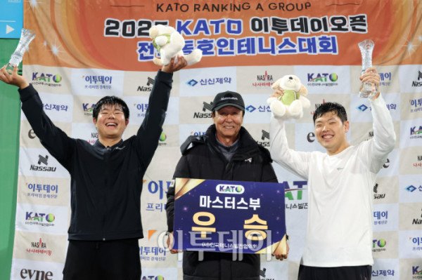 ▲7일 인천 부평구 열우물 테니스장에서 열린 2025 KATO 이투데이 오픈 전국동호인 테니스 대회 시상식에서 마스터스부 우승조인 염성민(왼쪽)·김재용 선수가 시상자인 김영식 한국테니스발전협의회(KATO) 회장과 기념촬영을 하고 있다. 고이란 기자 photoeran@