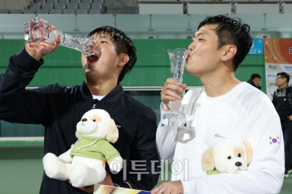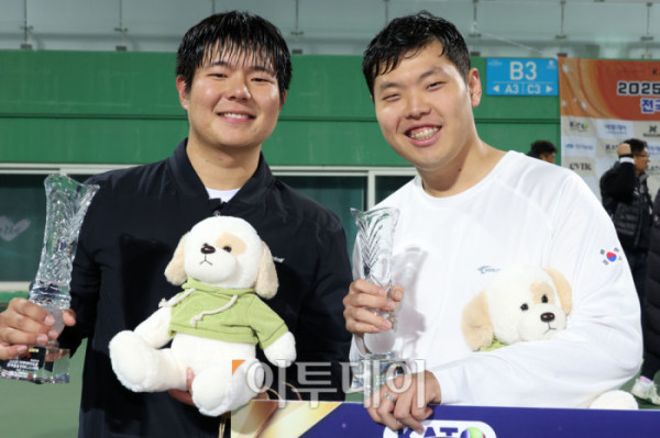 ▲7일 인천 부평구 열우물 테니스장에서 열린 2025 KATO 이투데이 오픈 전국동호인 테니스 대회 시상식에서 마스터스부 우승조인 염성민(왼쪽)·김재용 선수가 이투데이와 인터뷰에 앞서 포즈를 취하고 있다. 고이란 기자 photoeran@