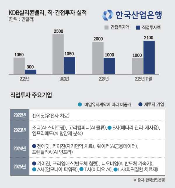 한국산업은행의 미국 벤처투자 거점인 KDB실리콘밸리가 설립 4년 만에 투자 전략 '대전환'에 들어섰다. 인공지능(AI), 바이오 등 딥테크 분야 유망 기업을 직접 발굴해 투자하는 규모가 사상 처음 펀드출자(간접투자)를 넘어서며 최대를 기록했다. 직접투자가 일반화된 현지 시장에 맞춘 투자 구조 개선이 본격화했다는 분석이 나온다.
