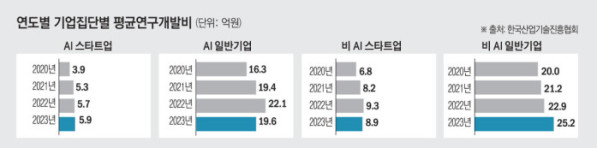 하지만 이번 데이터는 이러한 경고가 ‘미래 전망’이 아니라 이미 진행 중인 현실임을 확인시켜준다. 특히 재원 구조에서 취약성이 뚜렷했다. 2023년 기준 이들의 연구개발비 중 정부재원 비중은 22.9%로, 전 산업 평균인 5.7%의 4배에 달했다. 정부 출연금과 보조금이 사실상 AI 스타트업 생존기반을 떠받치는 구조다. 외부 민간재원 중 기업이 조달한 연구개발(R&D) 비중 역시 3.6%로 전 산업 평균(0.6%) 대비 6배 이상 높았다. AI스타트업이 타 기업군에 비해 외부자금에 지나치게 의존할 수밖에 없는 구조적 취약성을 뜻한다. 기술 난도는 세계 최고 수준으로 높아지는데 이를 뒷받침할 생태계 기반은 사실상 ‘존립 한계’에 가깝다는 의미다.