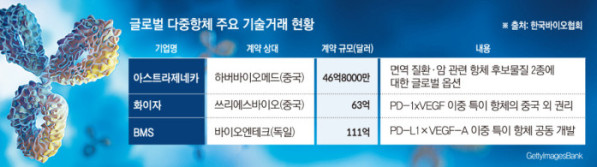 글로벌 바이오 기술거래 시장이 다중·이중특이 항체 중심으로 재편되고 있다. 글로벌 제약사 간 차세대 항암제 경쟁이 격화되면서 다중특이 항체 플랫폼이 향후 연구개발(R&D) 패러다임을 좌우할 핵심 기술로 부상할 것이라는 전망에 힘이 실리고 있다.