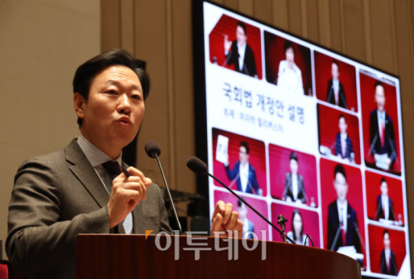 박수민 국민의힘 의원이 8일 서울 여의도 국회에서 열린 의원총회 '이재명 정부· 더불어민주당 입법폭주 국민고발회'에서 '국회법 개정안 설명, 마지막 필리버스터' 발표를 하고 있다. 고이란 기자 photoeran@