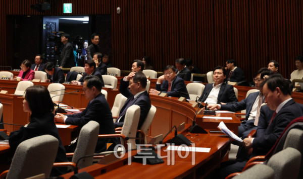 ▲국민의힘 의원들이 8일 서울 여의도 국회에서 열린 의원총회 '이재명 정부· 더불어민주당 입법폭주 국민고발회'에서 박수민 의원의 '국회법 개정안 설명, 마지막 필리버스터' 발표를 듣고 있다. 고이란 기자 photoeran@