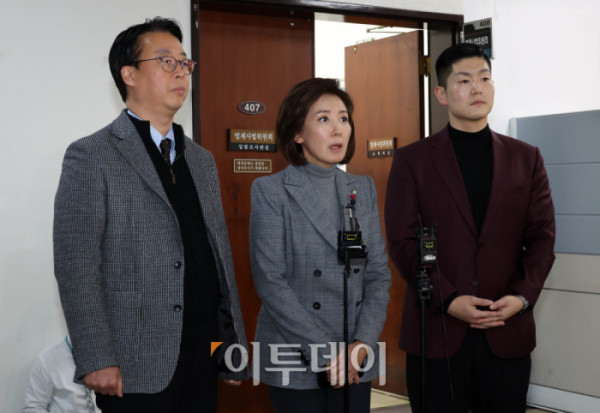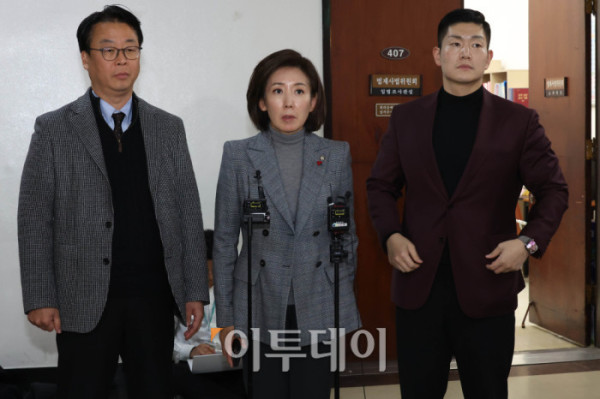 ▲나경원(가운데), 곽규택(왼쪽), 김재섭 국민의힘 법사위 의원이 8일 서울 여의도 국회에서 법사위 법안심사제1소위원회가 정회된 후 추미애 법사위원장이 대표 발의한 헌법재판소법 일부개정법률안과 관련해 입장을 밝히고 있다. 고이란 기자 photoeran@