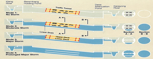 말레이시아 정부는 잦은 홍수 피해와 시내 교통 정체를 동시에 해결하기 위해 2007년 복합터널 ‘SMART’를 완공했다. 일정 강우량 이상 발생하면 차량 통행을 통제하고 터널 전체를 배수 통로로 전환한다. 총 사업비 약 6120억 원 중 69%는 말레이시아 정부가 부담하고 31%는 민간이 투자했다.