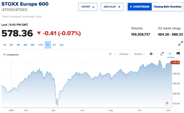 범유럽 주가지수인 스톡스유럽600 지수는 전 거래일 대비 0.41포인트(0.07%) 밀린 578.36에 장을 마감했다. 독일 프랑크푸르트증시 DAX30지수는 17.87포인트(0.07%) 오른 2만4046.01에, 영국 런던증시 FTSE100지수는 21.92포인트(0.23%) 내린 9645.09에, 프랑스 파리증시 CAC40지수는 6.31포인트(0.08%) 떨어진 8108.43에 거래를 마쳤다.
