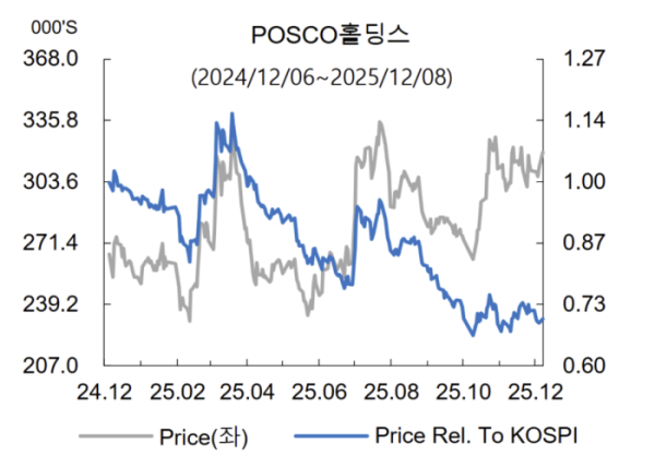 철강 업황과 관련해서는 단기 반등 가능성이 있지만 구조적 부담이 크다고 지적했다. 그는 “중국 철강사는 수익성이 좋았던 판재류를 중심으로 상반기 높은 가동률을 유지했지만, 내수 수요 부진으로 수익성이 악화되고 재고가 증가하면서 4분기 들어 가동률을 낮추고 있다”고 설명했다. 다만 동절기 종료 이후에는 “2026년 2~3월 전후 재고 감소 등 수급 개선과 함께 내수 가격 반등 흐름이 가시화될 전망”이라고 내다봤다.