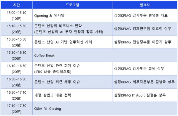 먼저, 이효정 삼정KPMG 경제연구원 상무가 콘텐츠 산업의 비즈니스 전략과 AI 투자 동향을 설명하고, 이준기 컨설팅부문 상무가 콘텐츠 산업 내 AI 기반 업무혁신 사례를 소개한다. 이어 설원 감사부문 상무가 ‘최근 감리동향과 IFRS 18 중심의 회계 이슈’를 다루고, 김병국 세무부문 상무는 ‘콘텐츠 산업 최신 세무 이슈’를 제시한다. 마지막으로 심정훈 감사위원회 지원센터 상무가 ‘개정 상법과 대응 전략’을 주제로 발표를 이어갈 예정이다.