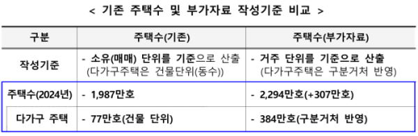 지난해 11월 기준 건물 단위 다가구 주택은 77만 호인데, 구분 거처를 반영한 부가자료에 따르면 384만 호로 307만 호 증가한다. 이에 같은 기간 총 주택 수도 1987만 호에서 2294만 호로 늘어난다.
