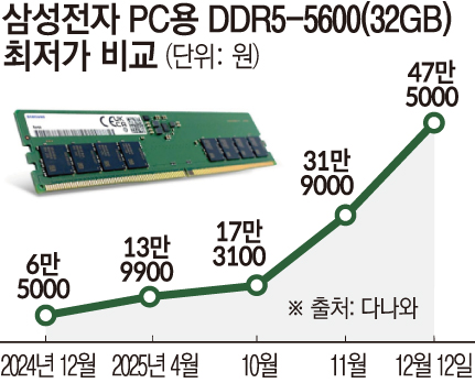 14일 본지가 가격비교사이트 다나와 통해 확인한 삼성전자 PC용 DDR5-5600(32GB) 제품의 최저가는 지난해 12월 6만5000원에서 올해 1월 11만2000원으로 오른 데 이어, 10월에는 17만3000원으로 상승했다. 이달 들어서는 무려 47만5000원(12일 기준)까지 치솟으며 1년 새 7배 가까이 급등했다. 증가율은 630%에 달했다.