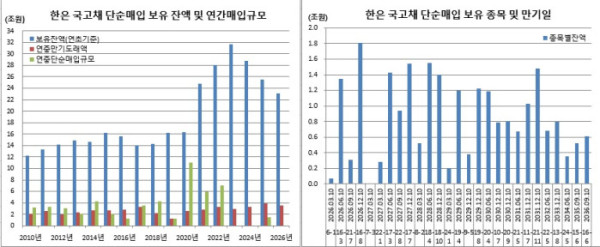 한편, 한은 보유 국고채의 내년 만기도래 규모는 3조5400억원이다. 종목별로는 6-1 700억원, 16-3 1조3500억원, 21-7 3100억원, 16-8 1조8100억원이며, 만기도래 시기는 각각 3월10일, 6월10일, 9월10일, 12월10일이다.