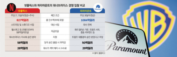 앞서 넷플릭스는 5일 워너브러더스를 720억 달러에 인수하기로 하는 최종 계약을 체결했다고 밝혔다. 주당 인수가격은 27.75달러였다. 부채를 포함하면 827억 달러 수준이다. 넷플릭스는 할리우드 스튜디오, HBO, 스트리밍 사업만 인수하려는 반면 파라마운트는 워너브러더스 전체 회사를 대상으로 한다.