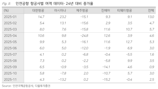 오정하 다올투자증권 연구원은 “연휴 효과가 없는 비수기 11월에도 인천공항을 포함한 국내 공항의 여객 흐름이 뚜렷하게 유지되고 있다”며 “특히 중국·일본 등 근거리 노선 강세와 미국 노선 회복세가 분명하게 나타나고 있다”고 설명했다.
