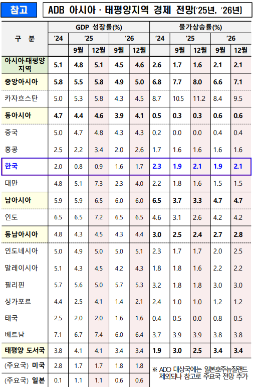 기획재정부에 따르면 ADB는 10일(필리핀 현지시간) 이 같은 내용이 담긴 '2025년 12월 아시아 경제전망'을 발표했다.