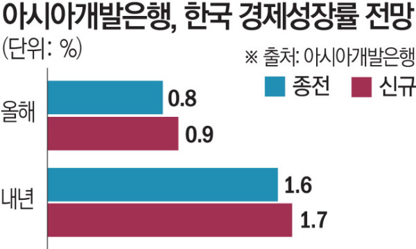 아시아개발은행(ADB)이 올해 한국의 올해와 내년 경제성장률 전망치를 0.8%에서 0.9%, 1.6%에서 1.7%로 각각 상향 조정했다.
