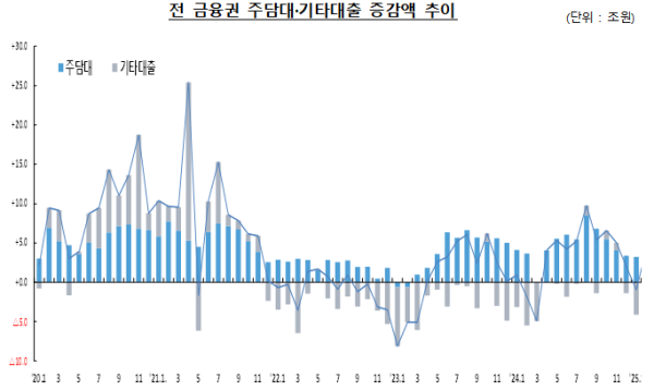 은행권의 경우 자체 주담대 증가액이 1조1000억 원에서 1000억 원으로 급감하며 전체 증가 폭 둔화를 견인했다. 일반 주담대는 5000억 원 증가했지만, 집단대출은 3000억 원 감소로 돌아섰고 전세대출도 2000억 원 줄었다.