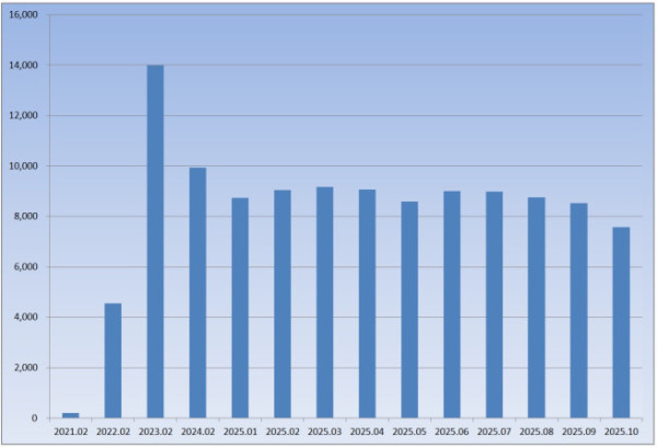 2022년 1월(3678가구)과 2월(4561가구) 각각 3000가구, 4000가구를 돌파한 데 이어 3월(6572가구) 단숨에 6000가구를 넘어섰다. 같은 해 9월에는 1만 가구(1만539) 이상이 됐고 다음 해인 2023년 2월 1만4000가구(1만3987가구)에 육박했다.
