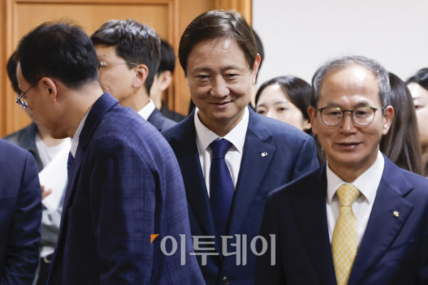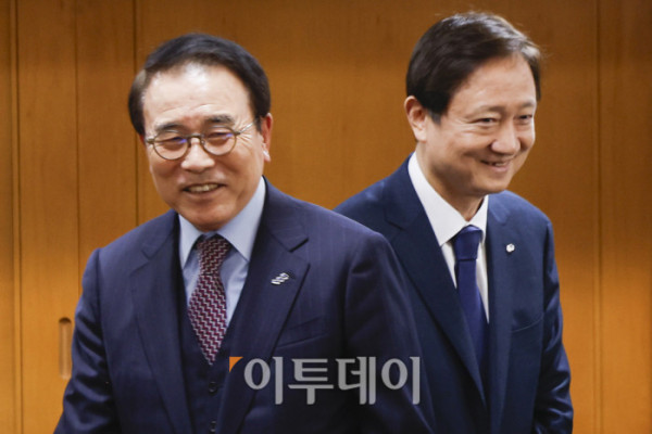 ▲이찬진(오른쪽) 금융감독원장과 조용병 은행연합회장이 10일 서울 중구 은행연합회에서 열린 금융감독원장-금융지주회장 간담회에서 기념촬영을 마친 후 자리로 이동하고 있다. 조현호 기자 hyunho@