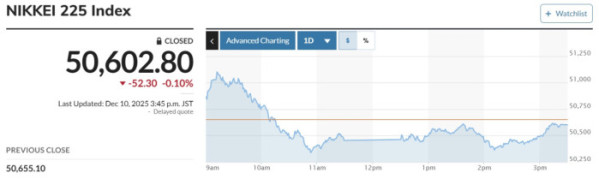 이날 마켓워치에 따르면 일본증시 대표 지수인 닛케이225 평균주가(닛케이)는 전 거래일 대비 52.30엔(0.10%) 내린 5만0602.80엔으로 마감했다. 급등 출발한 토픽스는 등락을 반복한 끝에 보합 마감했다. 종가는 전날보다 4.10포인트(0.12%) 오른 3389.02로 거래를 마쳤다.