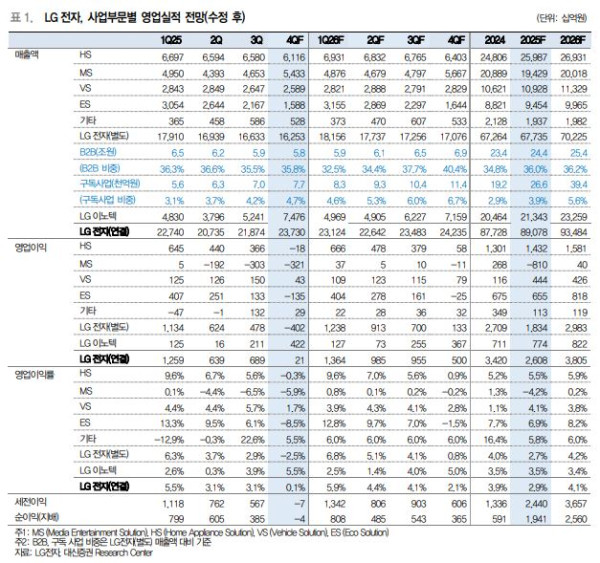 올해 4분기 영업이익은 205억 원으로 컨센서스(200억 원 적자) 대비 양호할 것으로 추정했다. 박 연구원은 “LG전자(별도)만의 영업이익은 4018억 원 적자로 적자전환을 예상하나 2026년 도약을 위한 선제적인 효율성 제고 비용이 반영됐다”고 말했다.