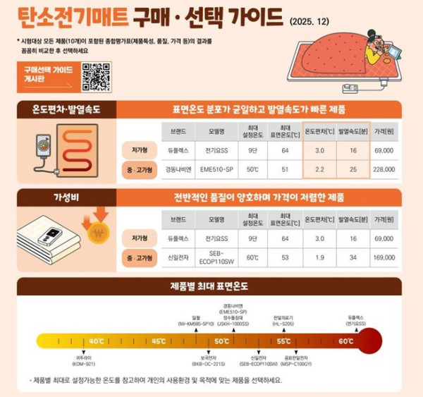 시중에서 판매 중인 탄소전기매트의 최대 표면 온도, 발열 속도 등 핵심 성능 차이가 큰 것으로 나타났다. 특히 두께가 얇은 저가형 제품일수록 발열 속도가 빨랐다. 제품 작동 시 발생하는 전자파, 누전·감전에 대한 위험 등은 모두 안전한 것으로 확인됐다.
