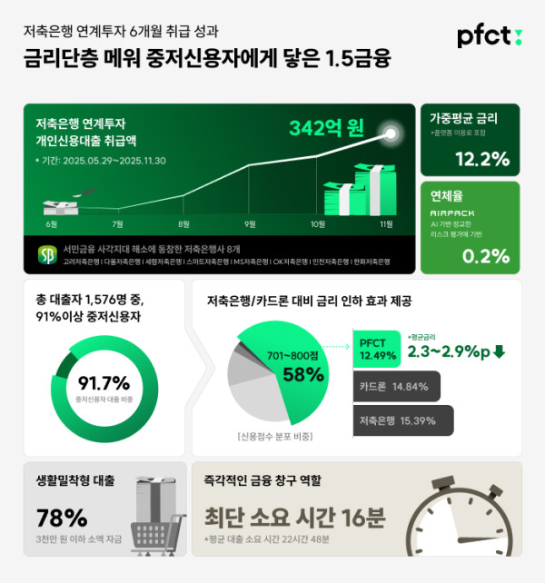 온라인투자연계금융사 피에프씨테크놀로지스(PFCT)는 혁신금융서비스로 지정된 저축은행 연계투자를 6개월간 운영해 342억 원의 개인신용대출을 공급했다.