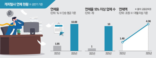 11일 금융감독원에 따르면 올해 상반기 기준 리스·할부금융사 등 51개 캐피털사 중 10곳의 연체율이 10%를 넘어섰다. 2022년 두 자릿수 연체율을 기록했던 업체가 1곳에 불과했던 점을 고려하면 3년 새 부실이 눈덩이처럼 커진 셈이다.