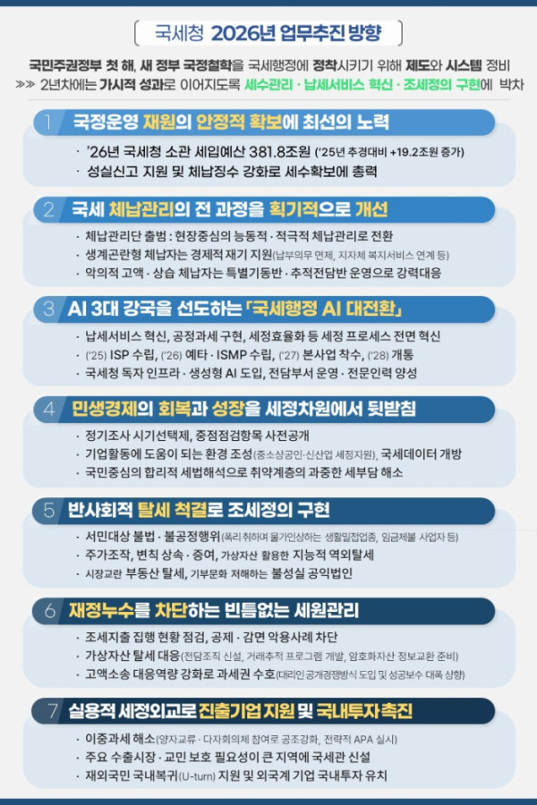 국세청은 11일 대통령 업무보고에서 △세무조사 시기 선택제 △기업·소상공인 세금애로 해소센터 설치 △세무조사 점검항목 사전 공개 △국세행정 AI 대전환 등 세정혁신 과제를 보고했다.