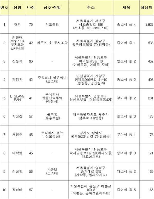 개인 체납자 가운데서는 권혁 회장이 가장 높은 체납액을 기록했다. 그는 서울 서초구 아크로비스타 주소지 기준으로 여러 건의 종합소득세 등을 미납해 3938억 원의 체납액이 발생했다.