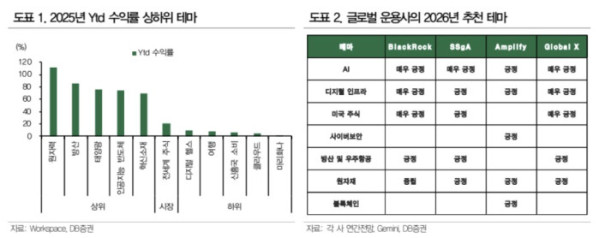 설태현 DB증권 연구원은 글로벌 테마 ETF 시장의 핵심 키워드는 올해에 이어 내년에도 AI가 될 가능성이 크다고 전망하며 “글로벌 운용사들이 지난해 12월 제시한 2024년 테마 ETF 키워드는 AI, 인프라, 원자력, 태양광 등이었다. 연초 이후 성과를 보면 원자력, 태양광, 인공지능 반도체 등 AI 관련 테마가 강세를 기록했고, 최근 발표되는 연간 보고서들 역시 2026년의 핵심 키워드로 AI를 공통적으로 지목하고 있다”고 설명했다.