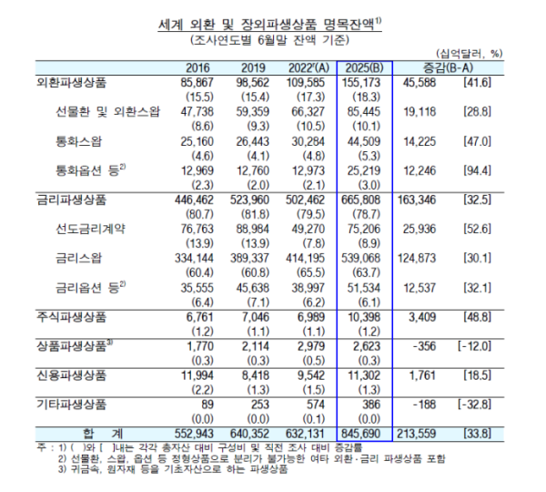 한국은행이 12일 발표한 BIS(국제결제은행) 주관 '세계 외환 및 장외파생상품 시장 조사(잔액 부문)' 결과에 따르면, 세계 외환 및 장외파생상품 명목잔액은 올해 6월 기준 845조7000억 달러를 기록하며 직전 조사 대비 33.8% 급증했다. 2022년 6월 말 632조1000억 달러 대비 213조6000억 달러 늘었다.