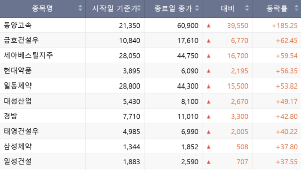 이 밖에 대성산업과 경방, 태영건설우, 삼성제약, 일성건설 등이 상승률 상위 종목에 이름을 올렸다.