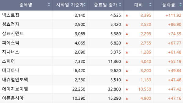이 밖에 피에스텍, 지니너스, 내츄럴엔도텍, 에이치브이엠 등이 상승률 상위 종목에 이름을 올렸다.