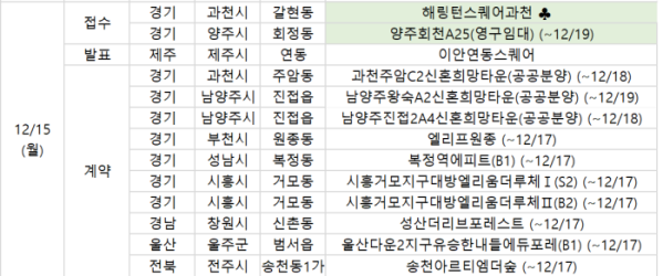 부동산 정보업체 부동산R114에 따르면 15일 오늘은 경기 과천시 '해링턴스퀘어과천(오피스텔)'이 청약 접수를 받는다. 양주시 '양주회천A25(영구임대)'는 이날부터 19일까지 청약 접수를 진행한다. 제주 제주시 '이안연동스퀘어'는 이날 당첨자를 발표한다.