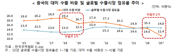 중국의 대미 수출 비중은 트럼프 1기인 2019년에는 전년 대비 2.5%p(포인트) 줄었지만, 글로벌 수출시장 점유율은 0.3%p 늘어났다. 트럼프 2기의 시작점인 2월부터는 미국의 대중 수입관세가 인상되며 올해 1~10월 중국의 대미 수출은 지난해 같은 기간보다 17.7% 감소한 반면, 대세계 수출은 베트남(22.3%), 인도(12.3%) 등 제3국을 중심으로 5.3% 증가해 15% 내외의 글로벌 수출시장 점유율을 유지하고 있다.