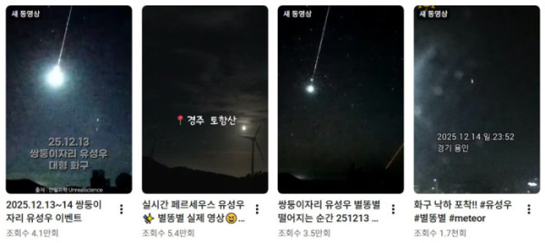유튜브에는 주말 밤 촬영된 쌍둥이자리 유성우 영상이 다수 올라왔다. 실시간 관측 영상이나 타임랩스로 기록된 별똥별 장면에 직접 보지 못한 이들이 댓글로 소원을 남기는 모습도 눈에 띄었다. “영상으로라도 보게 돼 다행”, “다음 유성우는 꼭 직접 보고 싶다”는 반응이 이어졌다.