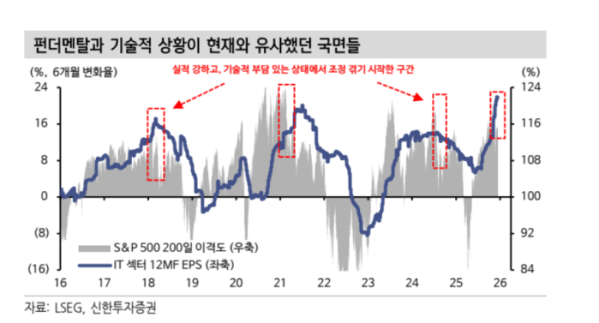 김성환·오한비 신한투자증권 연구원은 15일 “11월 이후 이어지는 조정은 강한 펀더멘털 속에서 누적된 과열 부담을 식히는 기술적 조정 구간”이라며 “5~10월 동안 빠르게 상승한 기술적 피로감이 최근 변동성 확대의 원인으로 작용했다”고 분석했다. 브로드컴 실적 발표 이후의 급락 역시 같은 맥락의 기술적 조정으로 해석했다.