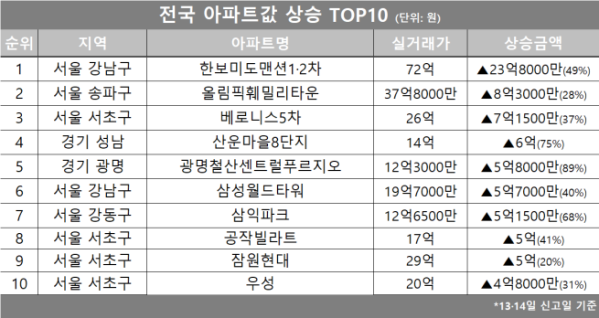 부동산 플랫폼 호갱노노에 따르면 13·14일 신고 기준 전국 아파트 가운데 실거래가 상승 폭이 가장 컸던 단지는 서울 강남구 ‘한보미도맨션1·2차’로 나타났다. 이 단지는 72억 원에 거래되며 직전 거래 대비 23억8000만 원(49%) 상승했다.