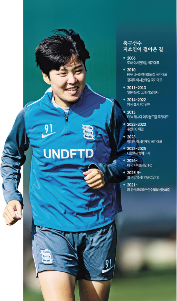 지소연은 도전을 두려워하지 않고 일본·영국·미국 등 다양한 리그를 경험했다. 그중에서도 국내 최초로 잉글랜드 첼시에서 보낸 시간은 그 자체로 성장의 과정이었다. 그는 “처음 갔을 때는 클럽 환경이 지금처럼 좋은 수준은 아니었다”며 “‘이 클럽을 가장 강한 팀으로 만들어보자’고 마음먹었다”고 회상했다.