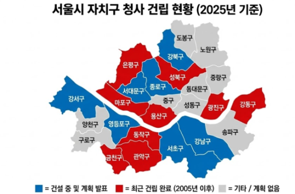한 자치구 관계자는 “새 청사를 지어서 옮기고 싶은 마음은 굴뚝같지만, 서울 시내에서 부지 확보가 만만찮다”며 “공식적으로 계획을 내놓지 못한 복수의 자치구도 내부적으로는 신청사 건립 계획을 갖고 있는 것으로 안다”고 말했다.