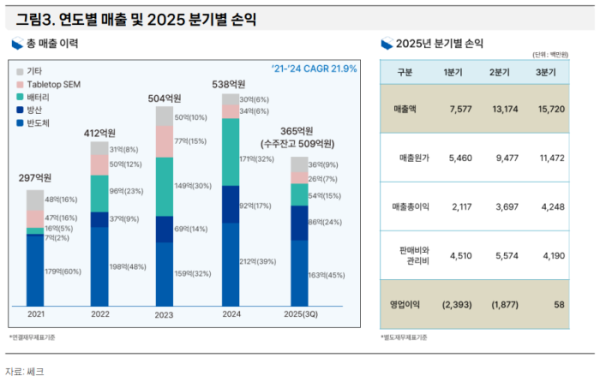 스터닝밸류리서치에 따르면 쎄크의 연구·개발(R&D) 장비와 배터리향 매출을 기반으로 한 완만한 성장세가 기대된다. 올해 예상 매출과 영업이익은 각각 564억 원(전년 대비 4.6% 증가), -20억 원(적자전환)으로 추정된다.