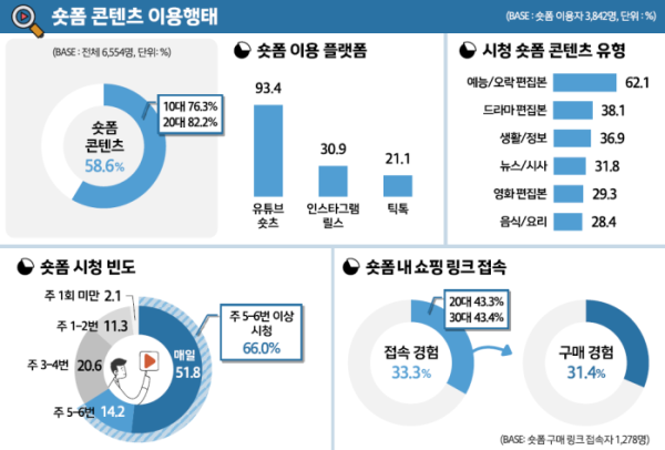 숏폼 콘텐츠 이용률은 58.6%로 시청 이유는 △짧아서 부담이 없어서(76.0%) △재미있는 부분만 보려고(51.4%) △추천 알고리즘 때문(47.0%) 순으로 나타났다. 숏폼 이용자 중 33.3%는 영상 안에 포함된 쇼핑 링크에 접속한 경험이 있었다. 이 가운데 31.4%는 실제 구매까지 이어졌다. 숏폼이 상품 구매로 이어지는 경로로도 기능하고 있는 것이다.