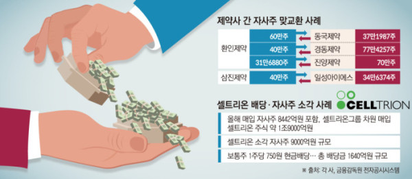 정부·여당이 자사주 소각 의무화를 핵심으로 하는 상법 개정을 추진하는 가운데, 일부 제약사들이 자사주를 서로 맞교환하는 방식으로 대응하고 있다. 이에 대해 자사주 소각을 통해 주주가치를 높이겠다는 제도 취지와 달리, 실질적인 주주환원 없이 자사주를 형태만 바꿔 보유하려는 것 아니냐는 지적도 나온다.